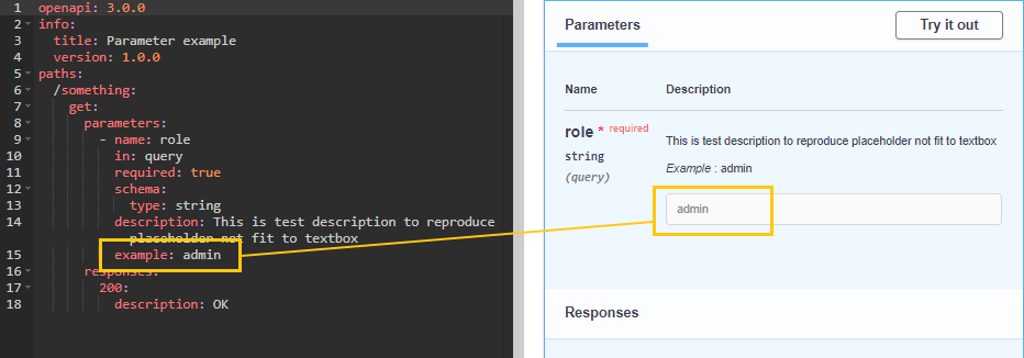 如果参数具有example或default值(或OpenAPI 2.0中的x-example ),Swagger将使用此值作为占位符。
