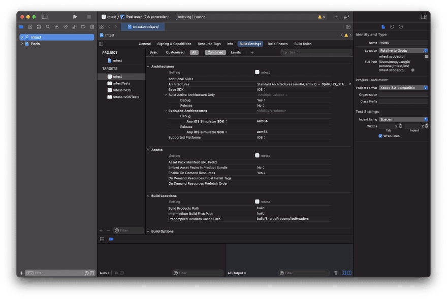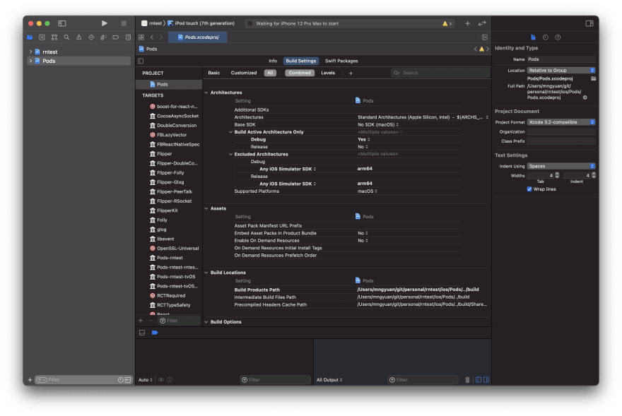 我们将把arm64架构排除在构建之外。在“目标”下,选择您的项目“->构建设置->排除体系结构”,并添加用于调试和发布的任何IOS模拟器SDK : arm64。对你的Pods项目也做同样的事情。