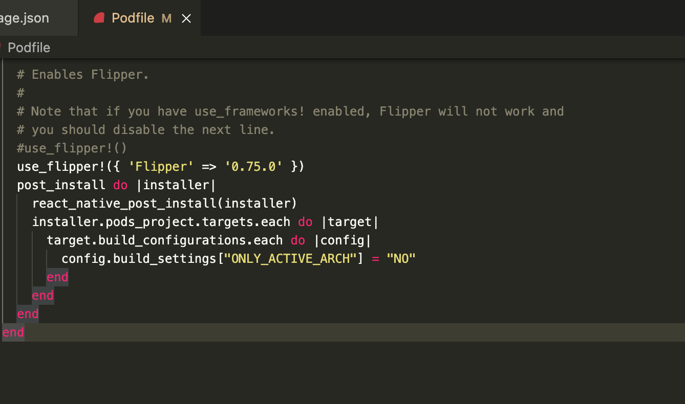 如果您的项目由于某种原因设置了VALID_ARCHS,那么在这个阶段您也希望从项目(以及Pods项目)中删除该键。我们非常接近完成,但安装在您的豆荚中的Flipper版本可能还不够新,不足以包括M1 macs的修复程序。打开ios/Podfile并应用以下内容