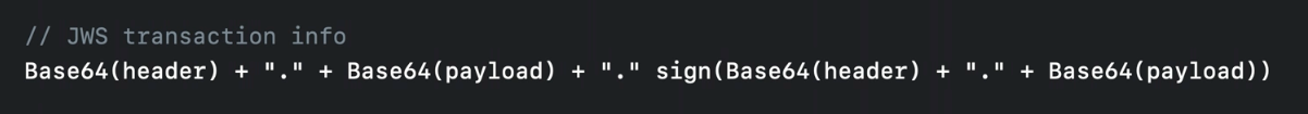 很容易解码有效载荷,但我找不到苹果在任何地方签署这些JWS/JWT的公钥。在使用JWT时,您只需使用节点jsonwebtoken库,并传入签名者公钥或共享密钥,这些密钥可以是配置的,也可以是从JWK获取的。