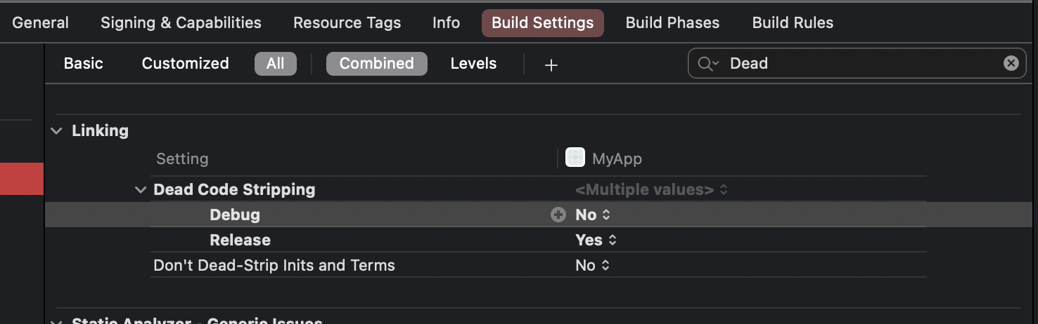 或者转到Xcode中的构建设置选项卡,然后为调试模式启用死代码剥离