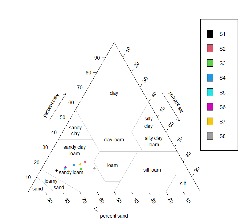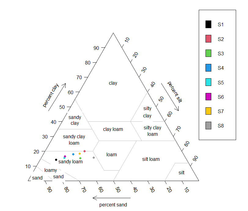 soil.texture(my_data[,2:4],col.symbols=1:8,bg.symbols=1:8,point.labels=my_data$area,pch=21)