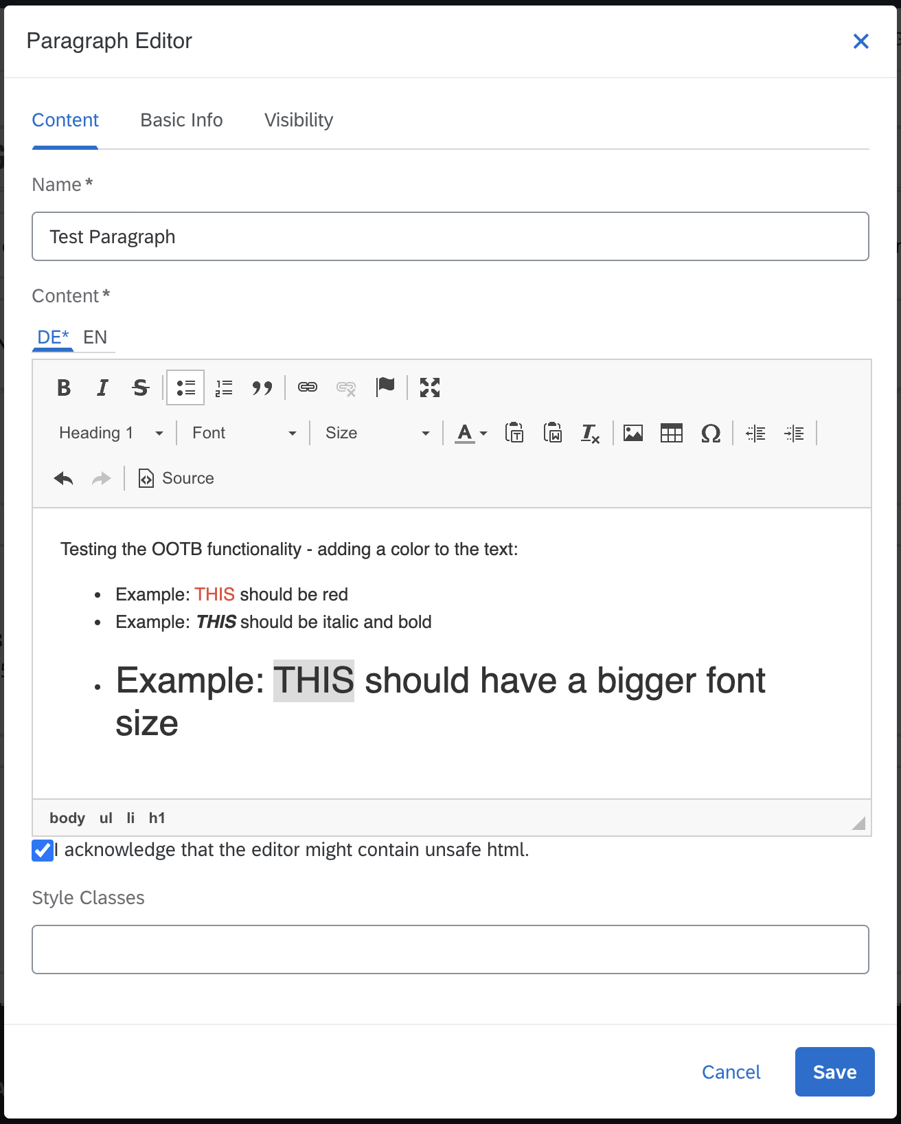 我一直试图使用SmartEdit中段落组件中最简单的OOTB特性之一(来自Spartacus店面的some新安装)--在Rich中为某些文本添加颜色--但是组件似乎会净化HTML,从而删除我的样式。
