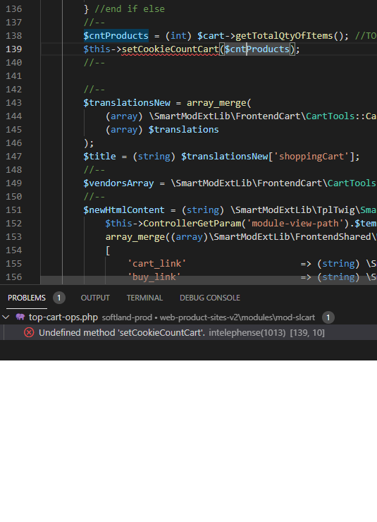 Undefined method 'setCookieCountCart'. inteliphense(1013),但是函数是按顺序定义的,并且代码工作是。