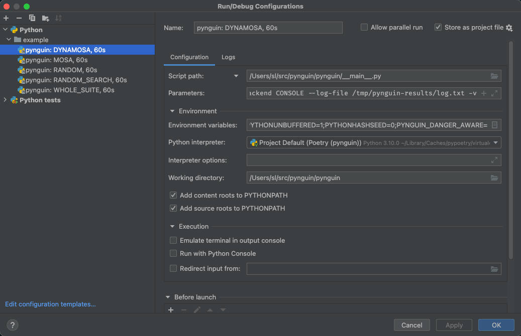 如果您使用的是PyCharm,可以通过将PYNGUIN_DANGER_AWARE=添加到“环境变量”字段(请参阅我的屏幕快照)来设置“编辑配置”中的值: