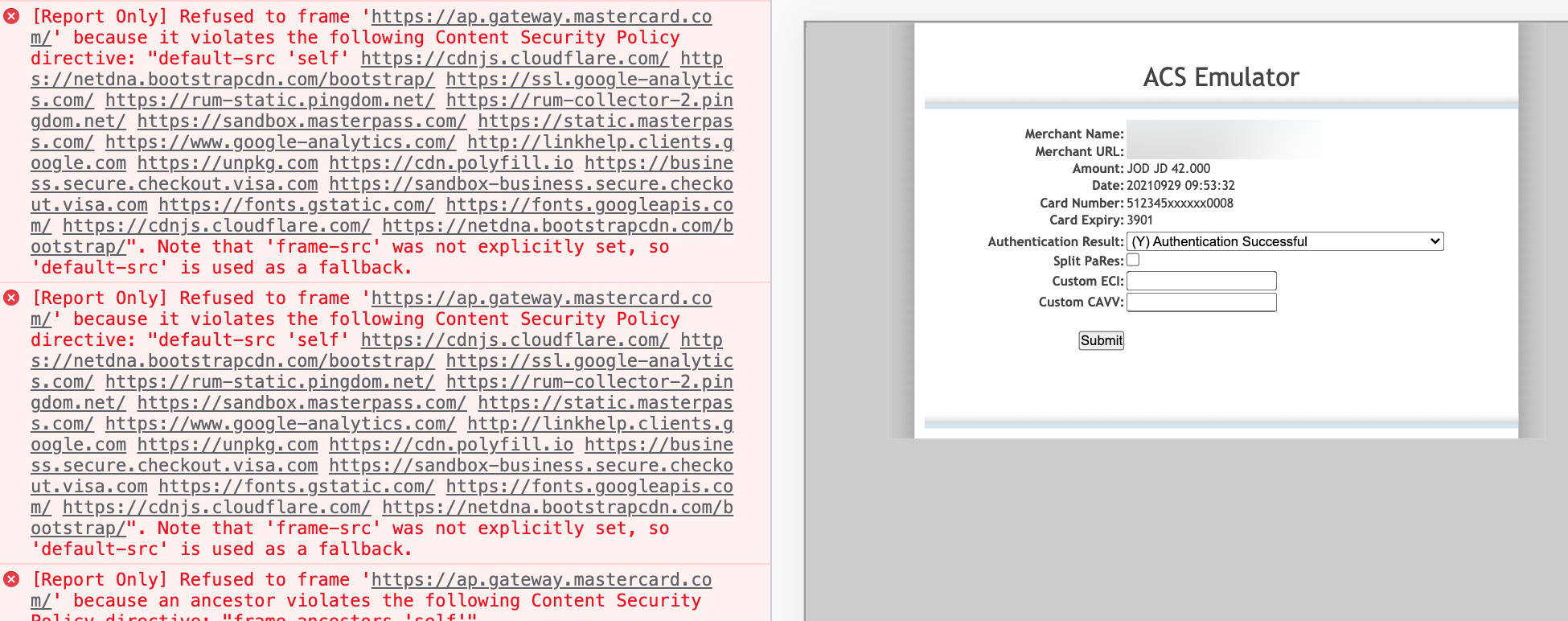 我还注意到,在从支付门户重定向到ACS仿真之间的控制台中存在安全错误,我怀疑这些错误可能与此有关,但我认为这些错误超出了我的控制范围,因为它们不是来自我的站点。或者他们有?