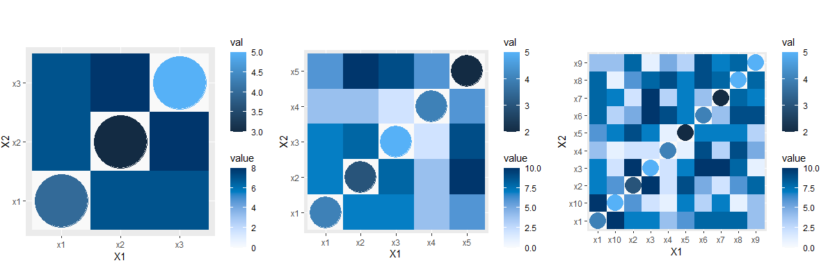 因此,在上面的图像中,对角线包含geom_points,其大小手动设置为size = 20.这适用于这个示例,但问题是:如果热图尺寸更改为20x20,那么硬编码为等于20的大小由于重叠(点太大等)而无法工作。
