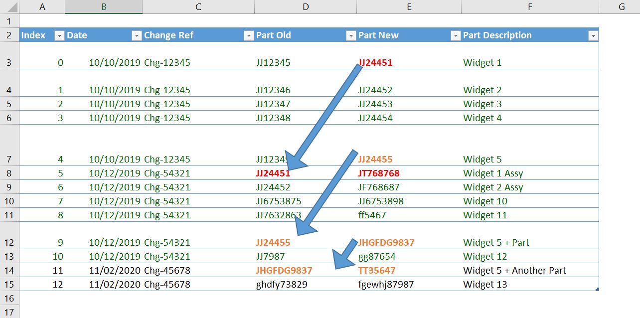 引用附件,我有两个表,第一个ChangeRegTBL是一个动态表(目前有一些7500+线长),它将我们实现的更改附加到构建/装配线中。在某些情况下,这些部件号的更改将再次更改为新编号(…)。在某些情况下,是7-8次!