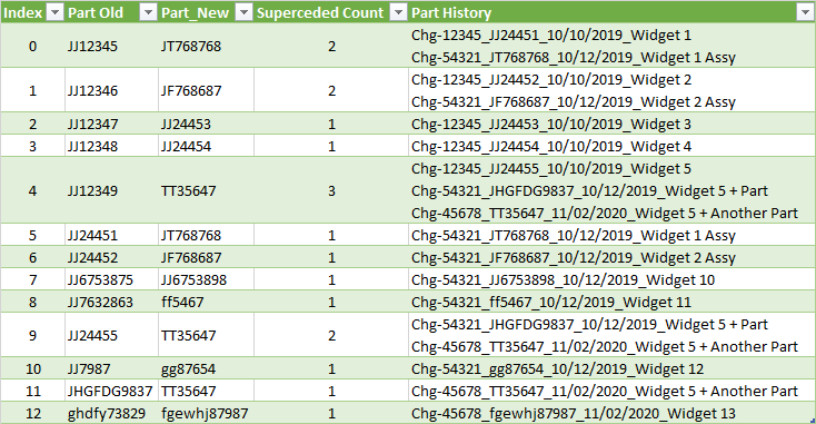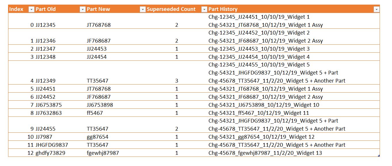 我想要的是一个表(在参考附件中显示为ChangeHistTBL ),它列出了“旧”的每个部分的历史以及它取代的“新”部分是什么,如果更改不止一次,则为计数,最后是汇总日期、更改请求和部分细节的历史表。