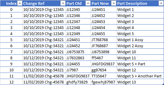 #"Changed Type" = Table.TransformColumnTypes(#"Promoted Headers",{{"Index", Int64.Type}, {"Change Ref", type text}, {"Part Old", type text}, {"Part New", type text}, {"Part Description", type text}}),