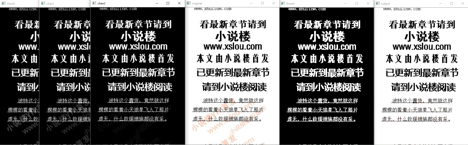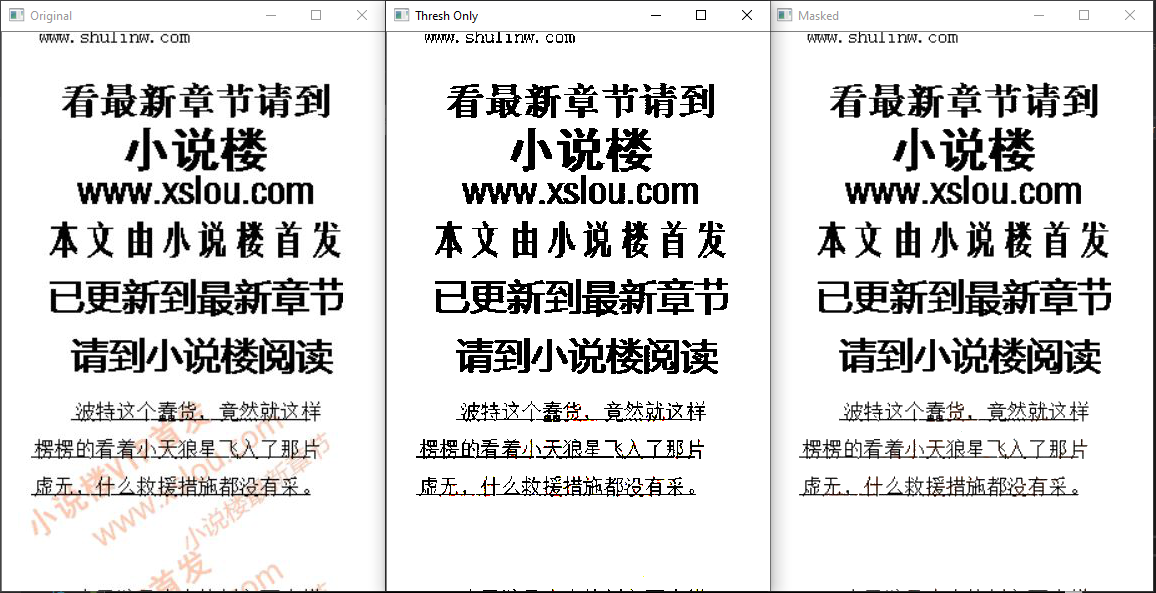 您可能只是阈值,但切断平滑的低像素计数文本实际上会损害后续的ocr相当严重。因此,我创建了一个掩码来消除水印,然后将其应用于原始图像(这也会拉出灰色文本边界)。另一个有帮助的技巧是使用红色通道,因为水印是最饱和的红色~245)。请注意,这需要opencv和c++17