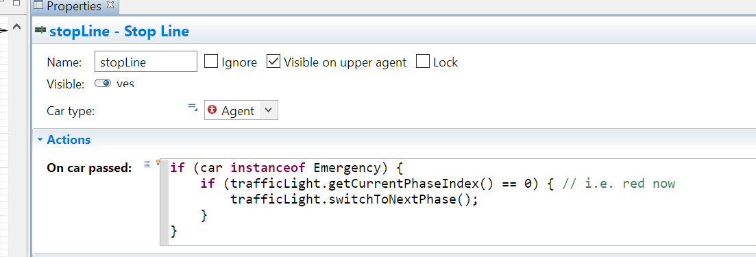 这显然是假设您在定制的CarType Emergency路上有汽车。然后,每辆车检查“我是紧急情况”,如果是的话,它检查交通灯当前是否是红色的(假设0是红色的)。如果是这样的话,它将进入下一个阶段(显然,它应该被定义为绿色)。