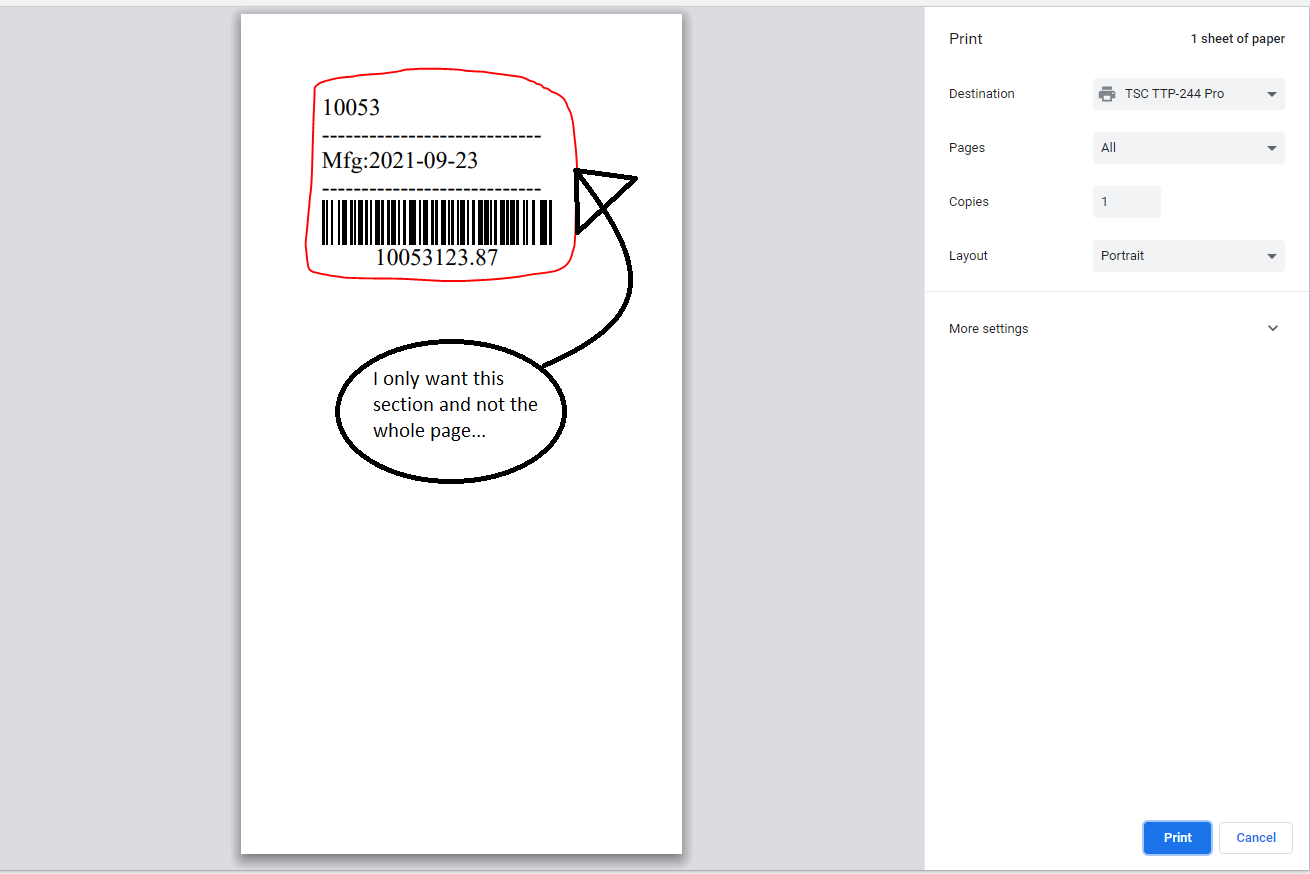我有一个条形码打印机和一个贴纸卷,打印机要在上面打印条形码。每个标签的尺寸为2.5“* 1.5”。我已经用一个库生成了条形码--当我打印这个条形码时,浏览器正在打印整个页面,而不仅仅是条形码--我尝试过不同的方法,比如制作div,给它特定的宽度/高度,只打印特定的div,但是问题仍然是一样的。。