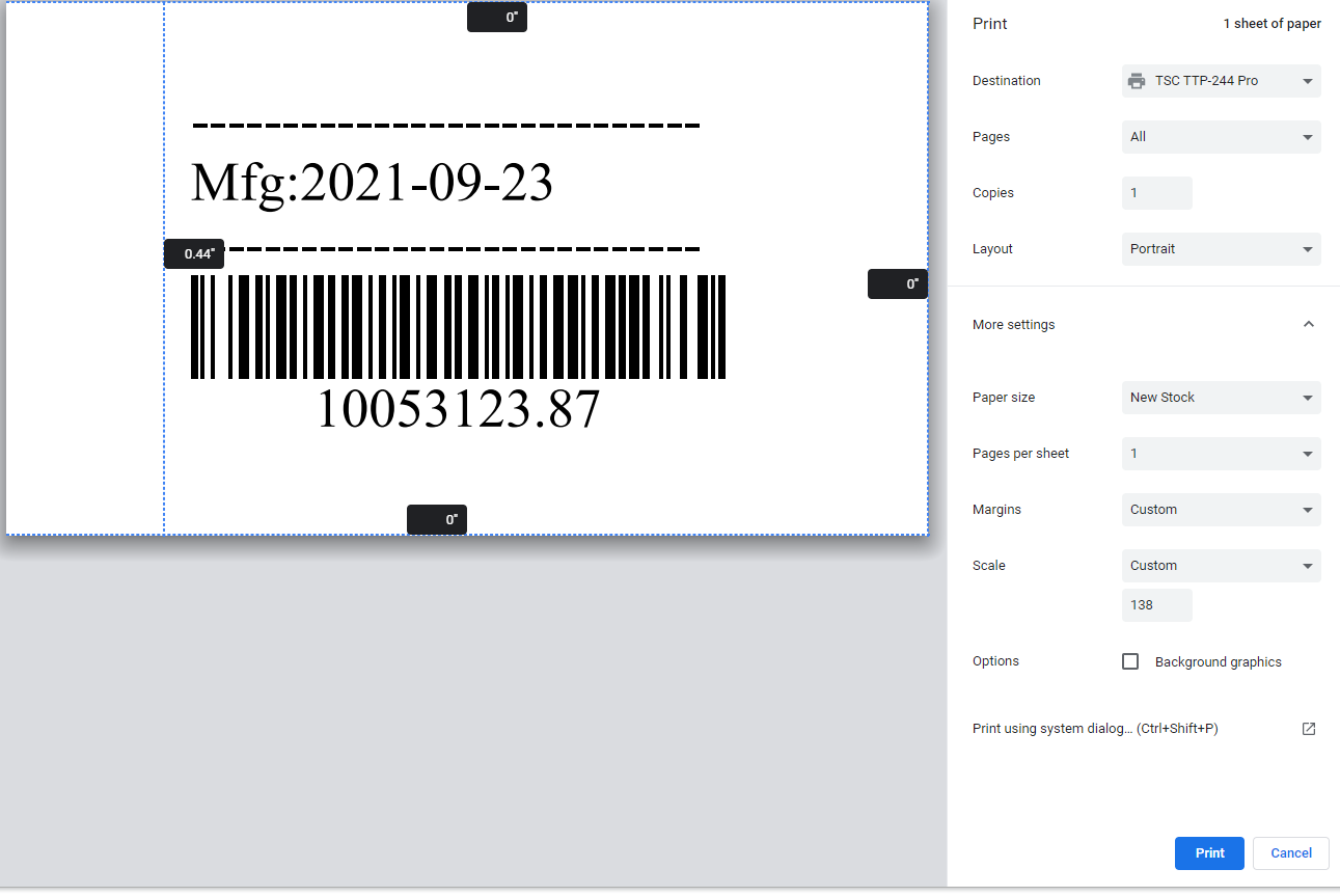 在“更多设置下拉”中,纸张大小必须与您使用的纸张大小相匹配。如果您的大小(2.5“* 1.5)不存在,可以添加它。这通常是在操作系统的打印机设置中完成的。