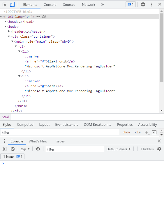 在控制台中,子类别通常应该列在li标记中的"Microsoft.AspNetCore.Mvc.Rendering.TagBuilder“部分中。但这不管用。
