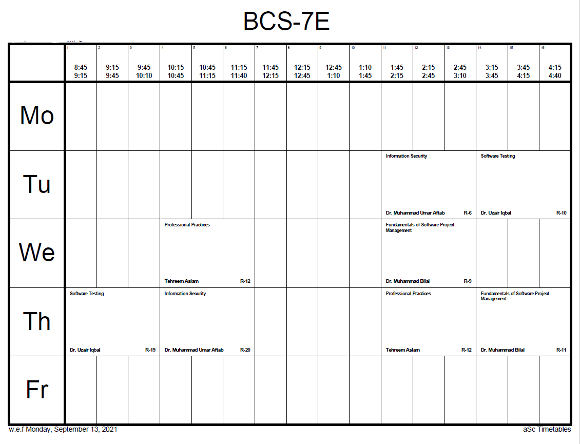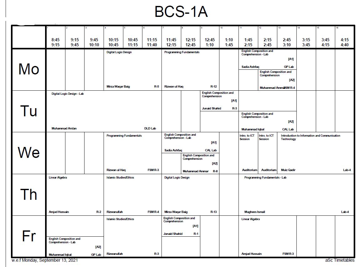 moday_schedule[16]; // it will be an **linked list** array of 16 size. Each index can be empty or may contain as many slots as possible. Each index represents the time slot in the timetable. For example "0th" index will represent the time slot of 8:45 to 9:15, 16th index will represent 4:15 to 4:40 and etc.