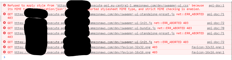 我无法弄清楚我的API网关或swagger-ui-express的正确设置。lambda函数成功运行并返回html,但是相关资源无法加载并得到404错误。