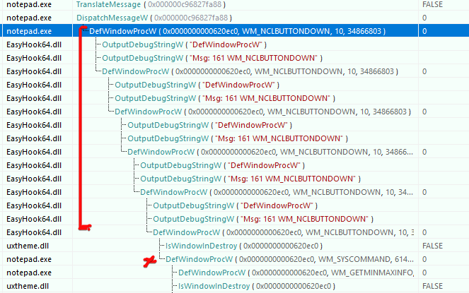 为了防止为同一个DefWindowProcW调用调用钩子,我们可以检索下一个钩子的旁路地址并调用它,而不是像通常那样调用原始DefWindowProcW。