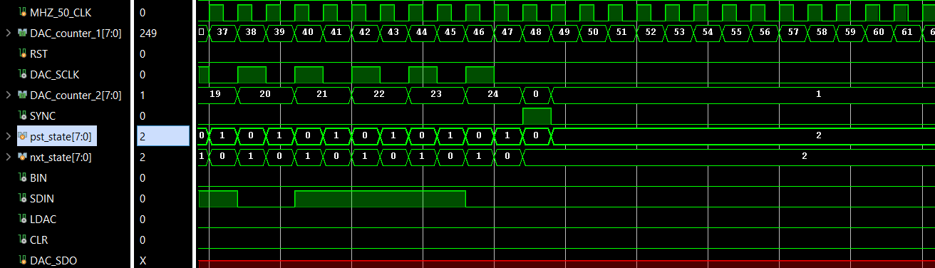 end正如您的波形所显示的,一旦进入状态2,您将保持状态2。由于状态2中的DAC_counter_2不是10,所以始终执行else子句,该子句不会更改nxt_state。