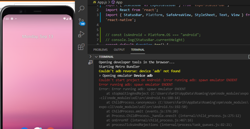 我试图在android设备模拟器上打开我的本机应用程序,但我面临一个错误: