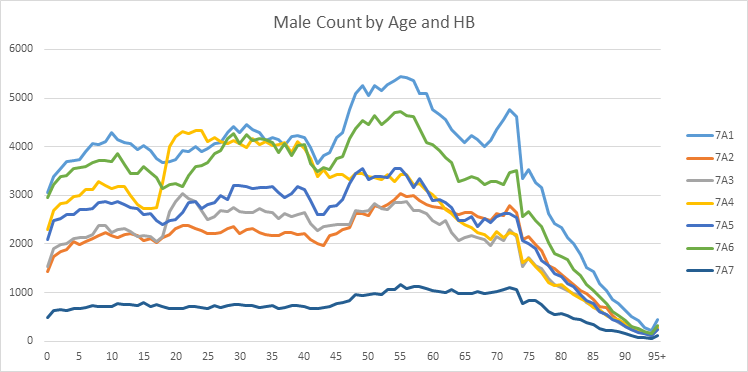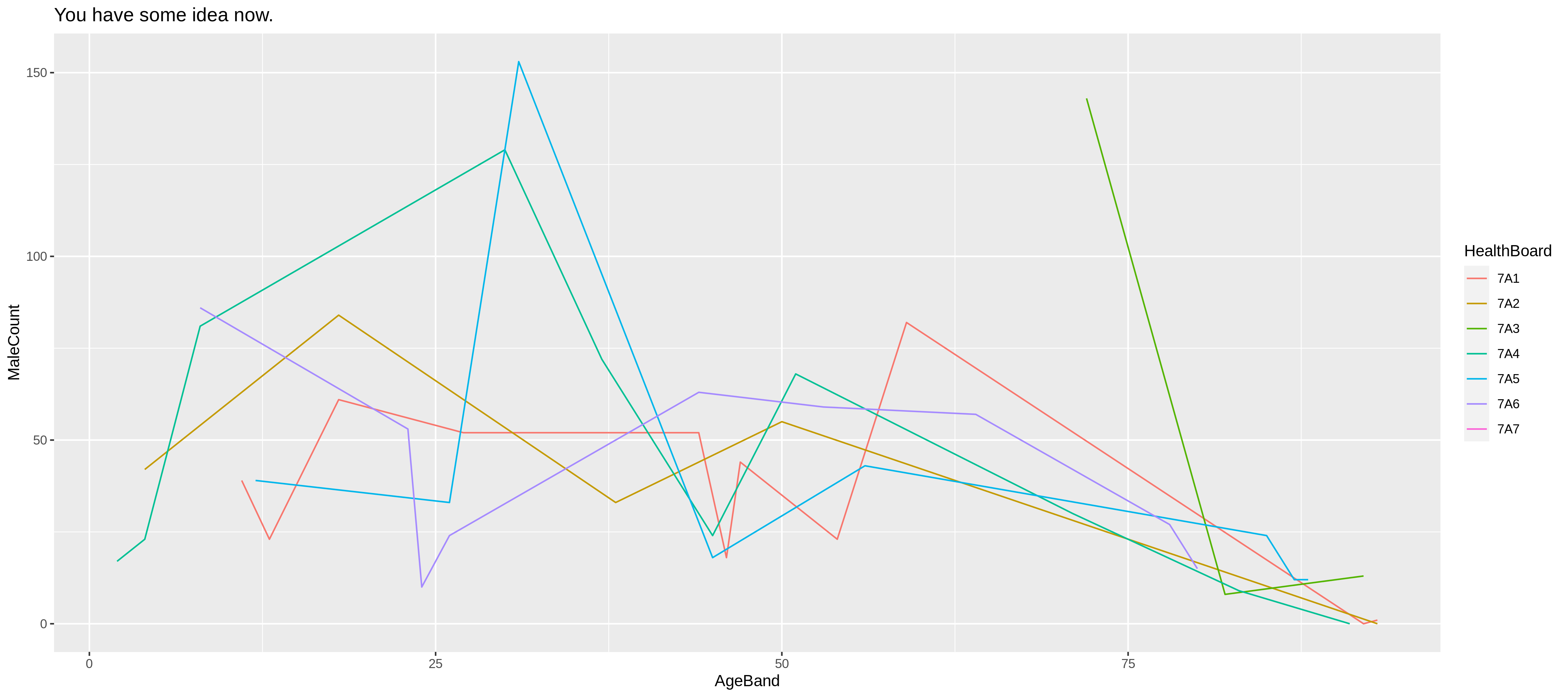 ggplot(aes(x=AgeBand,y=MaleCount,color=HealthBoard))+