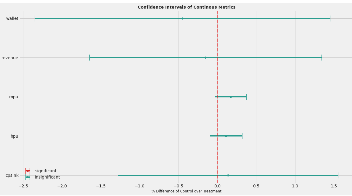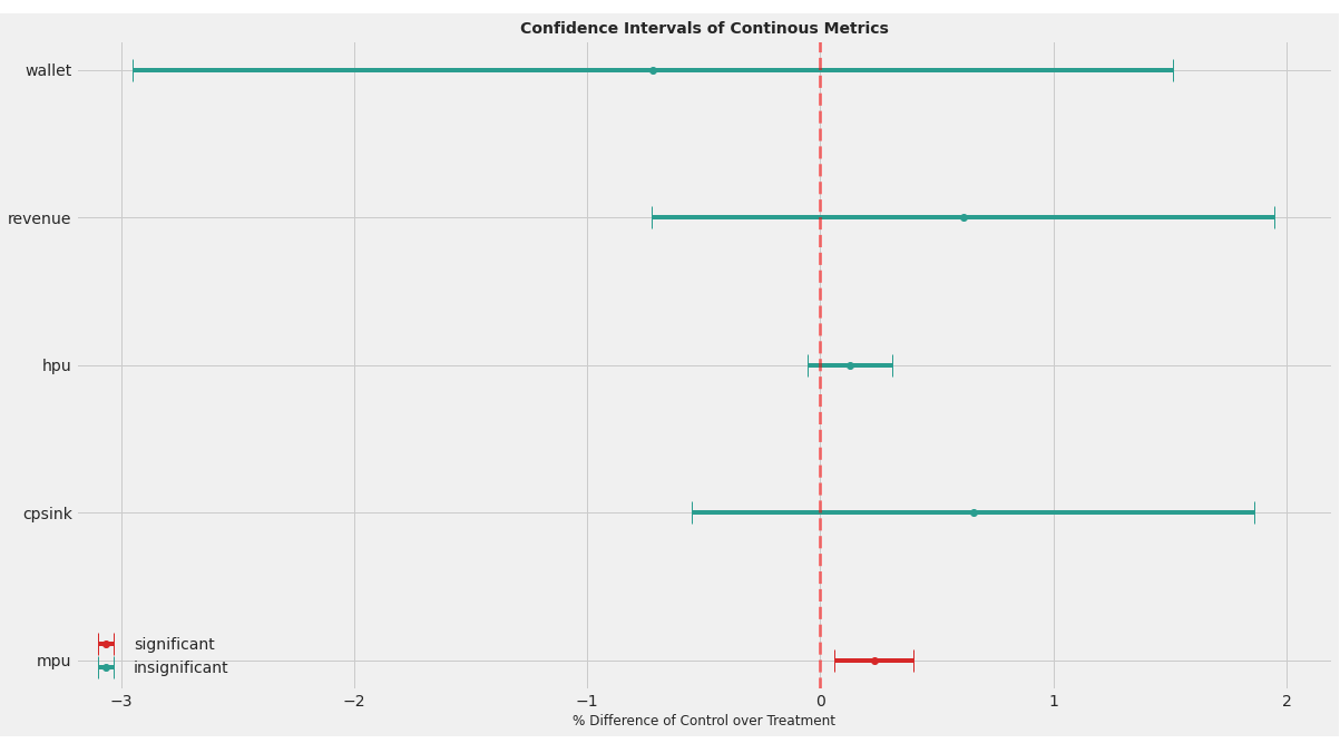 plt.title("Confidence Intervals of Continous Metrics", size=14, weight='bold')