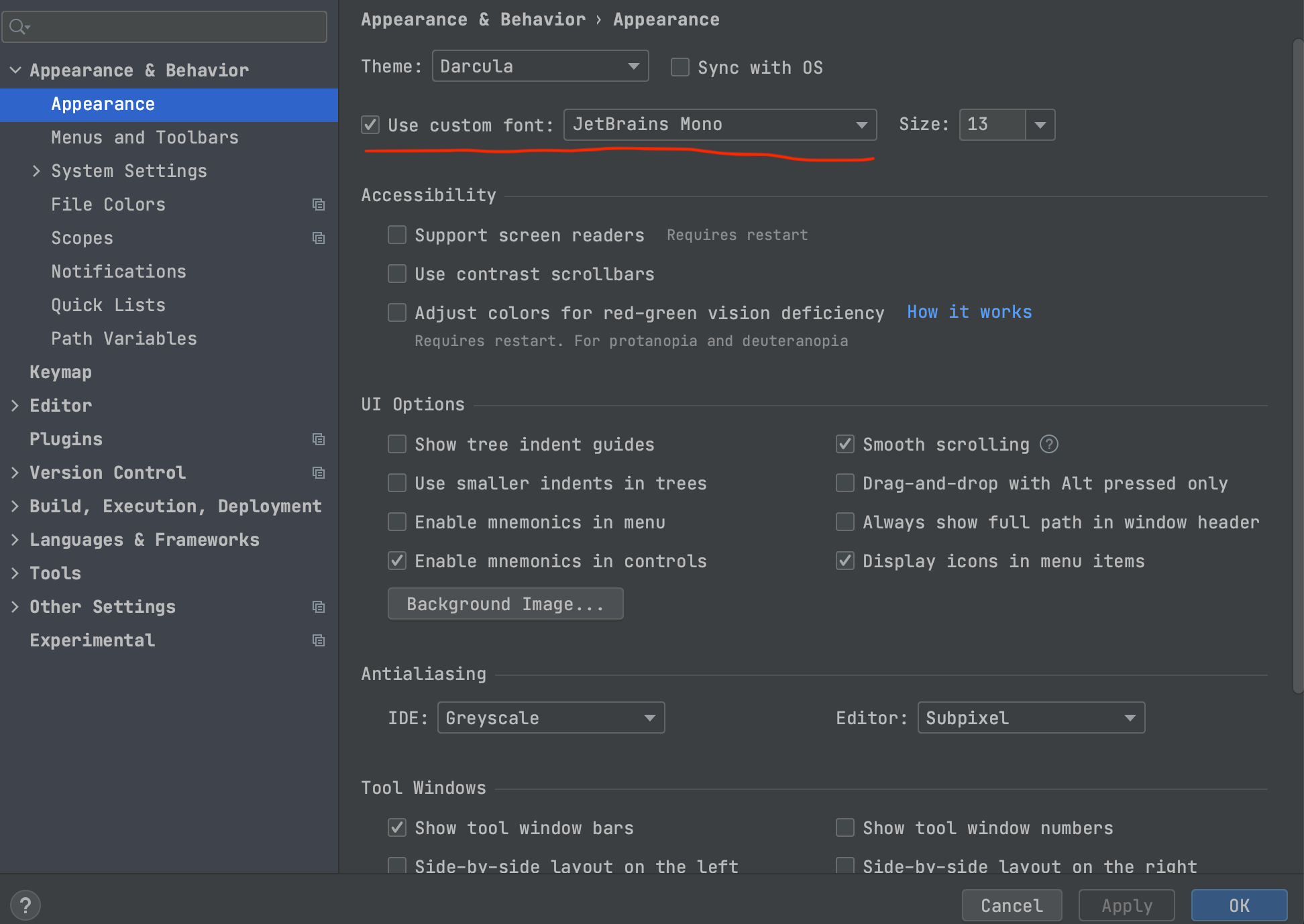 您可以访问Android的首选项(如果您正在使用MacOS)。然后转到外观&行为=>外观=>检查使用自定义字体并选择JetBrains Mono。最后,单击OK。如果你不清楚,请看这里的图片。