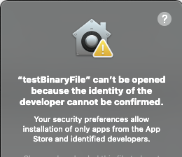 您的守门员安全设置不允许这样做,因为它甚至不是一个应用程序。结果可能是隔离了它,这意味着您必须运行xattr -d com.apple.quarantine /path/to/file才能运行它。
