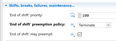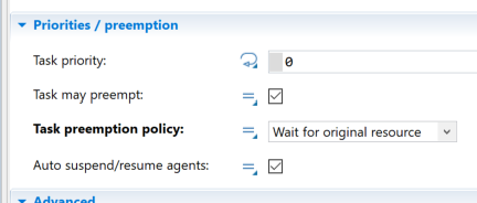 要处理移位结束抢占任务等待资源返回轮班的情况,您可以使用Service块的"On任务暂停“和"On任务恢复”操作,这些操作会在任务挂起(由于抢占原因)或恢复时触发(当原始资源可用时,如果这是您选择的抢占选项)。