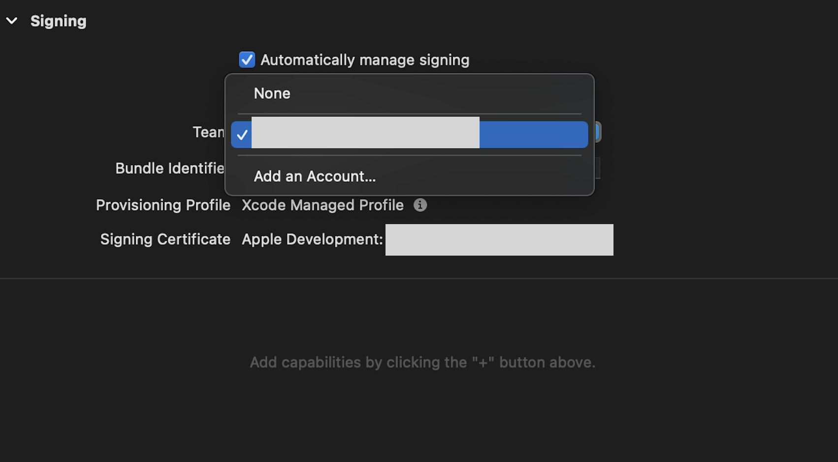 但我似乎不知道如何在我的Xcode构建中签名到那个帐户,该帐户现在已链接到我的个人帐户