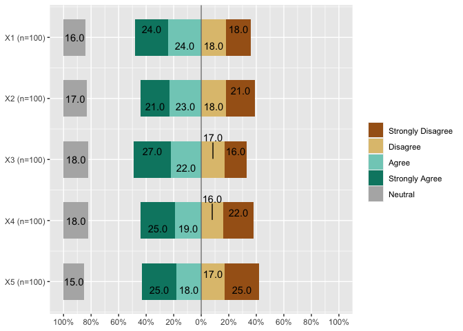 另外,请注意,plot_likert只适用于偶数个类别(参见?plot_likert)。但是,您可以通过选项cat.neutral设置一个中性类别。