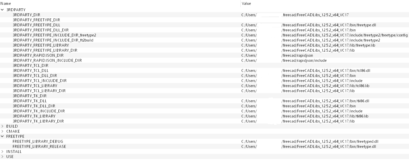 在CMake中配置OCCT项目时,我已经能够找到FreeCAD libpack和RapidJSON中某些变量(例如有关FREETYPE的变量)的正确值,但仍然会在配置中出现一些错误,似乎不管我尝试了什么值: