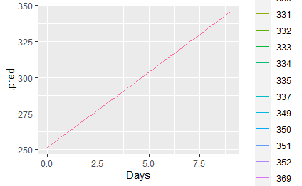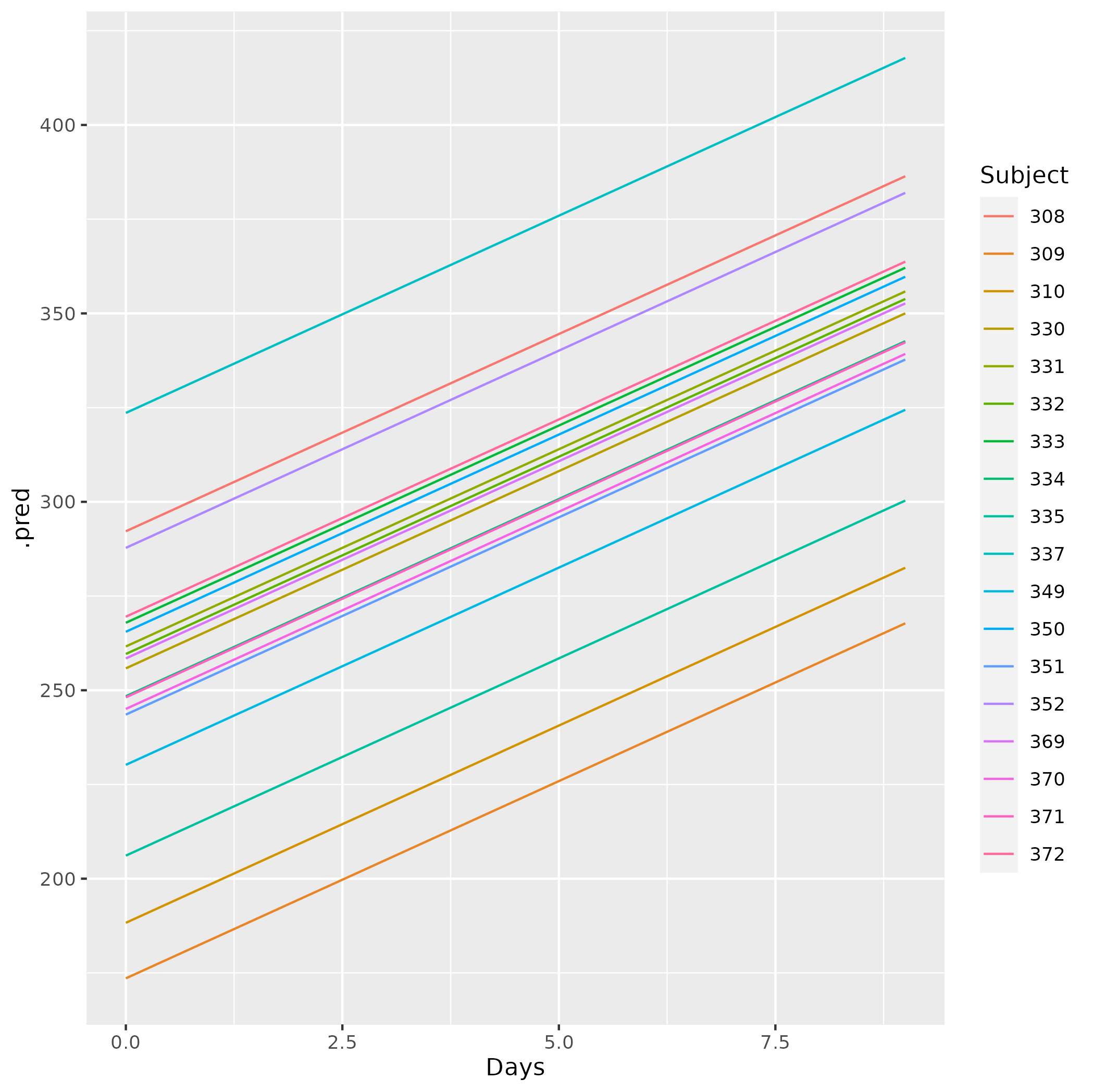 ggplot(predicted_df_tidy,aes(x=Days,y=.pred,colour=Subject))+