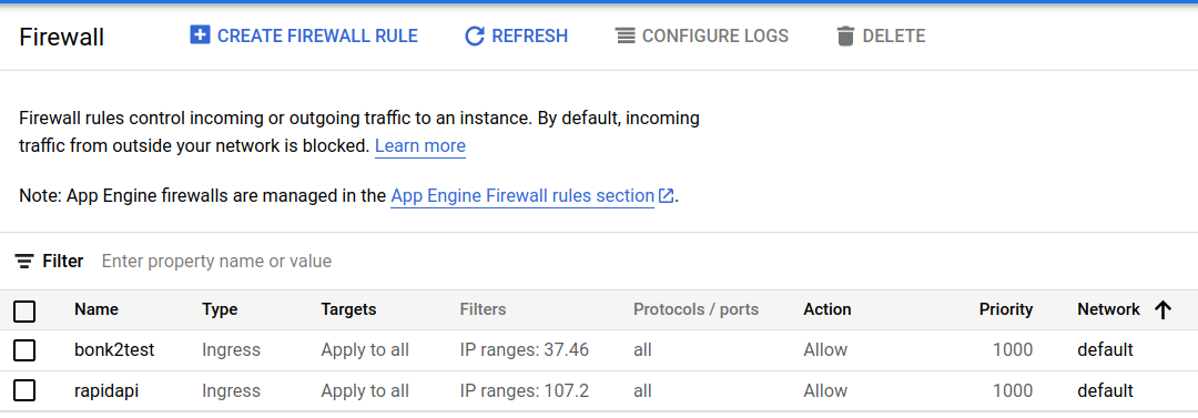 在添加静态ip之后,我也尝试使用静态ip调用从服务器上运行的容器,但是得到了相同的错误消息forbidden 403,因此问题似乎完全是针对入口流量的防火墙设置。