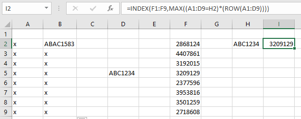 =INDEX(F1:F9,MAX((A1:D9=H2)*(ROW(A1:D9))))
