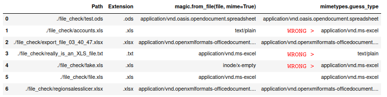 df = pd.DataFrame(data, columns=['Path', 'Extension', 'magic.from_file(file, mime=True)', 'mimetypes.guess_type'])