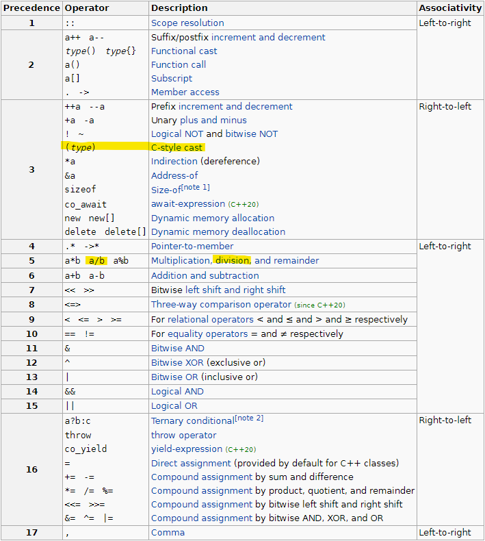 如果有疑问,请咨询cppreference.com。他们的运算符优先图显示C风格的转换比除法具有更高的优先级: