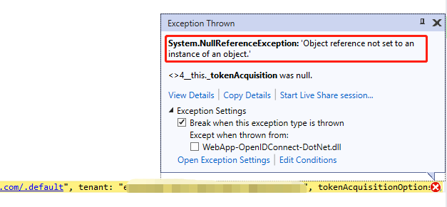 目前,由于无法使用ITokenAcquisition GetAccessTokenForAppAsync方法检索令牌,所以我陷入了困境。它一直产生一个NullReferenceException。我不知道我的启动设置是否错了什么的,但我搞不懂。
