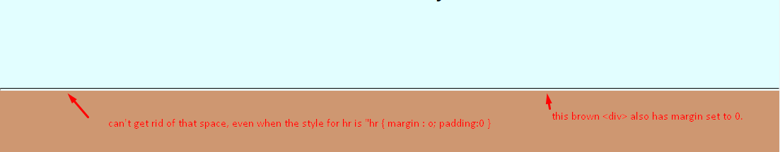 不过,我在它们之间有一个垂直空格(约3px)。我已经尝试过将所有的边距和填充设置为"0",甚至还试图使<hr>成为每个<div>的子级,并使用<hr>属性(这总是使<hr>消失).有人能帮这里的新手吗?
