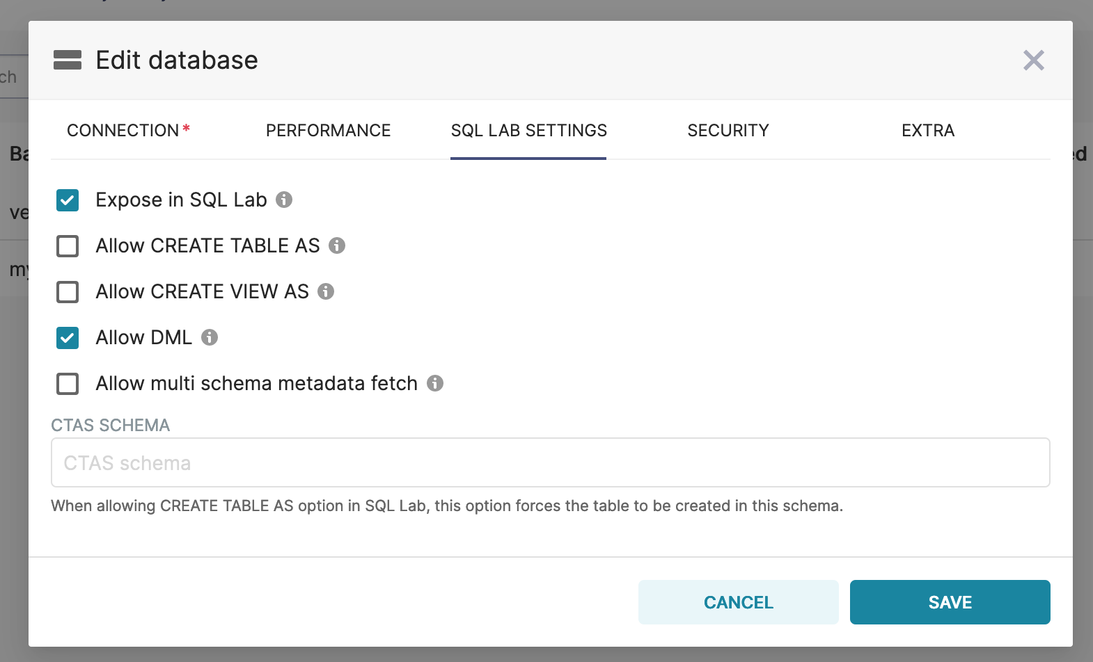在在超级集中为Trino社区广播创建表的时候,我也遇到了类似的问题。默认情况下,Superset禁用任何DDL和DML,以避免UI中的意外。尝试打开Trino的数据库设置,选择settings选项卡,然后单击“允许DML”。我知道这在技术上是DDL的,但是在DML之外有一些额外的命令,这是启用的,所以它可能对您有用。