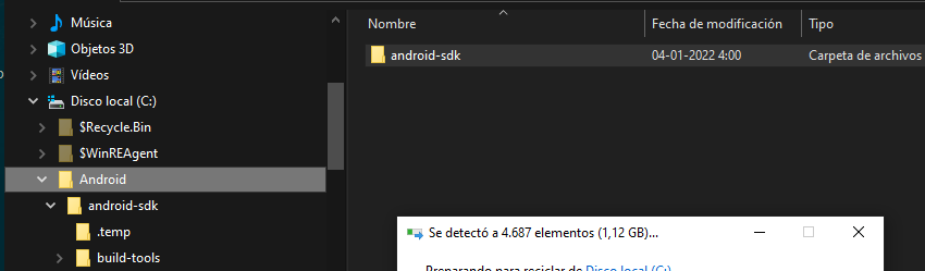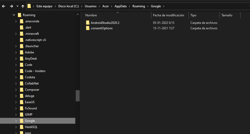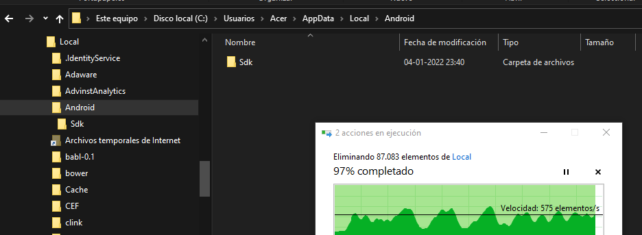 在Usuario\appData\Android文件夹中,删除其所有内容