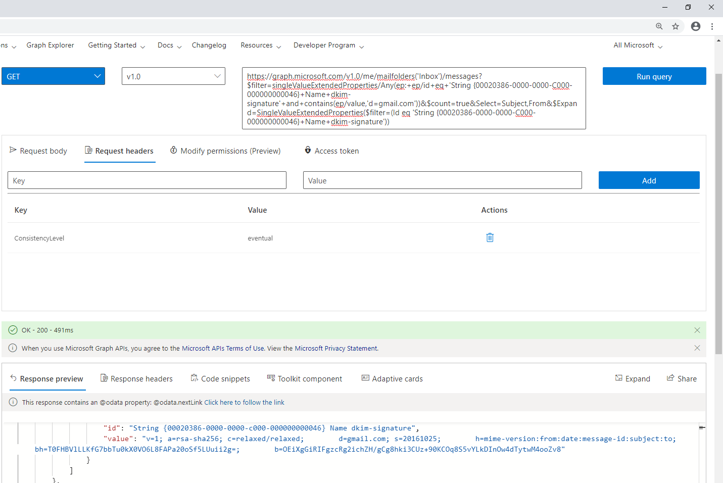 https://graph.microsoft.com/v1.0/me/mailfolders('Inbox')/messages?$filter=singleValueExtendedProperties/Any(ep:+ep/id+eq+'String {00020386-0000-0000-C000-000000000046}+Name+dkim-signature'+and+contains(ep/value,'v=1; a=rsa-sha256; c=relaxed/relaxed; d=blah-com.xxxx.blahsmtp.com'))&$count=true&Select=Subject,From&$Expand=SingleValueExtendedProperties($filter=(Id eq 'String {00020386-0000-0000-C000-000000000046}+Name+dkim-signature'))