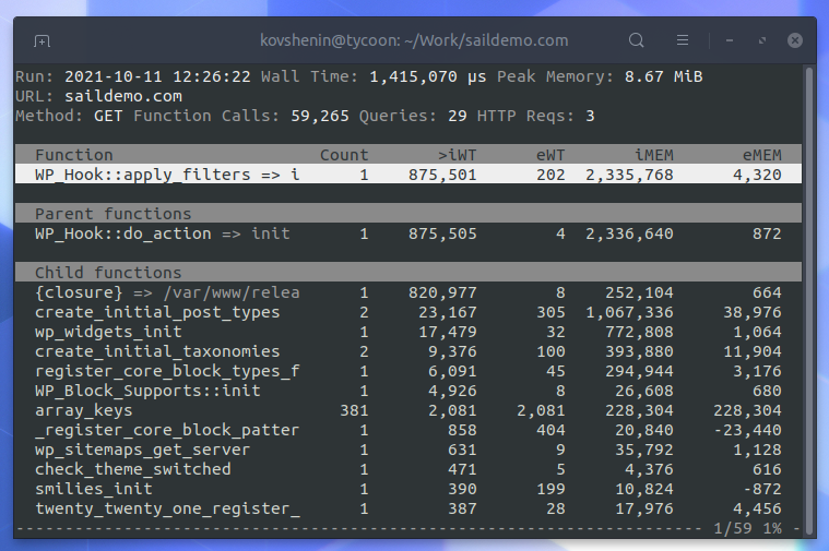 修改后的XHProf版本附带了我为WordPress编写的部署工具,其中包含一个基于CLI的配置文件浏览器,它将显示每个连接到WordPress操作或过滤器的函数以及它们的时间,并允许您挖掘它们的父函数和子函数: