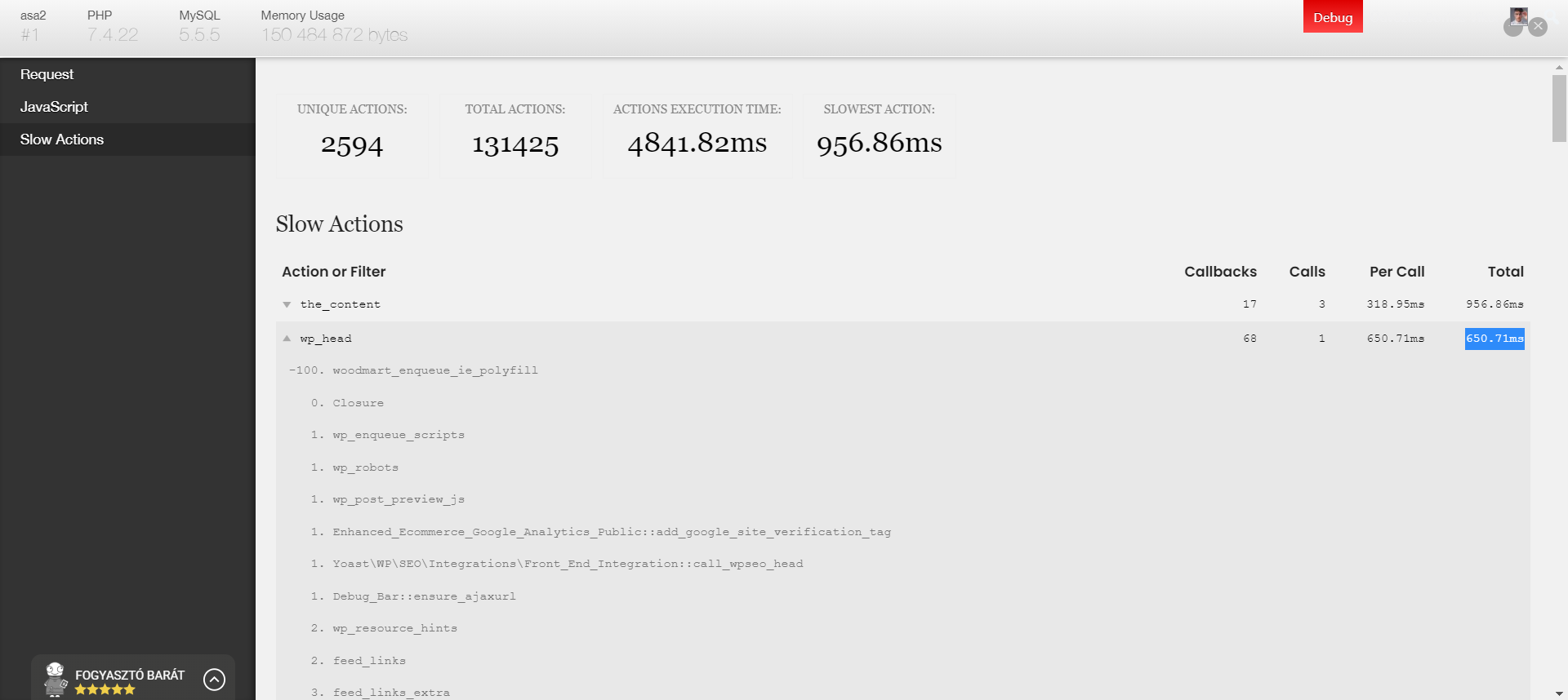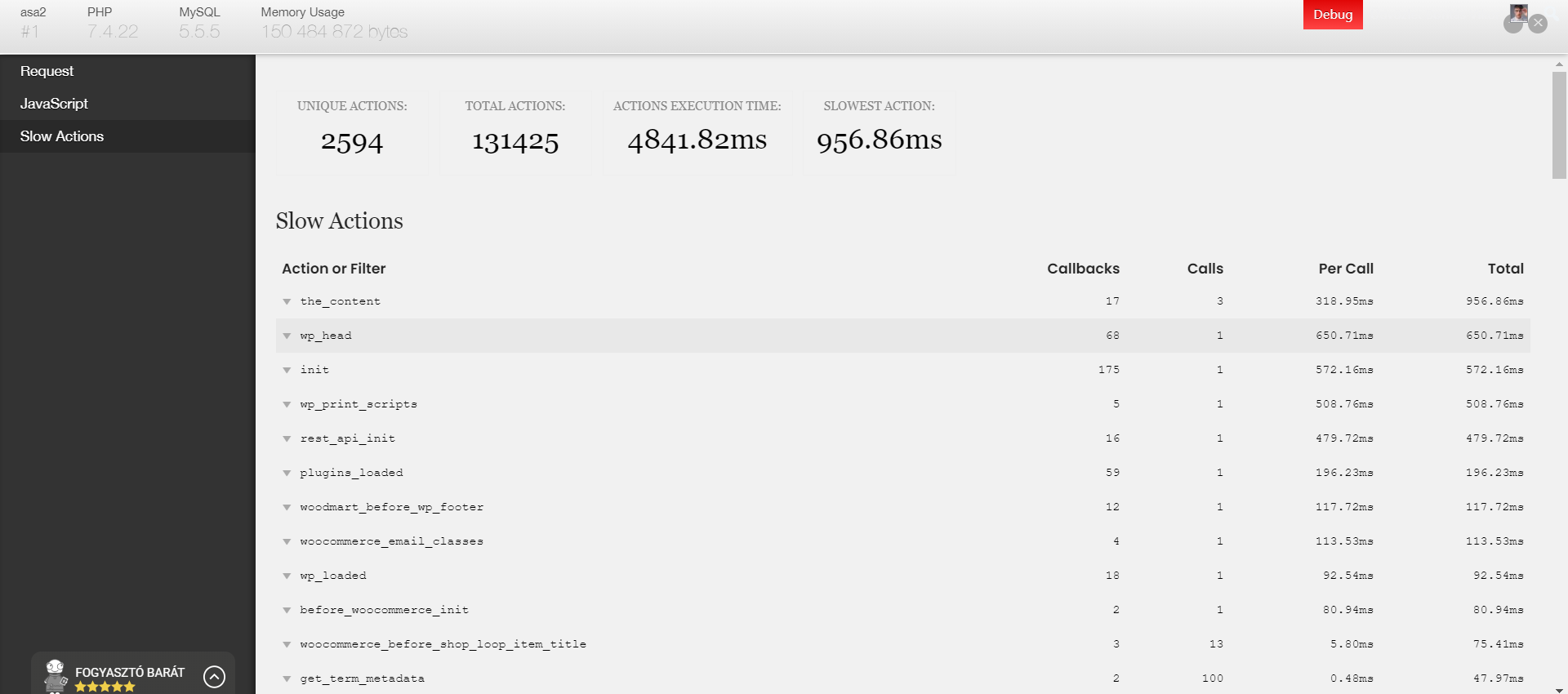 这是'Debug‘插件的UI,带有’慢速动作‘插件,这是一个很好的开始,但是现在对我来说还不够,因为它只显示钩子本身的总运行时间,而不是一个接一个地附加到它们上的单个函数(回调)。