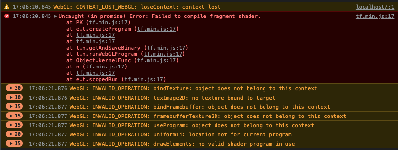 正如@vladimir-mandic建议的那样,问题最终是GPU耗尽了内存。但是,将WEBGL_DELETE_TEXTURE_THRESHOLD设置为零对我的情况没有帮助。