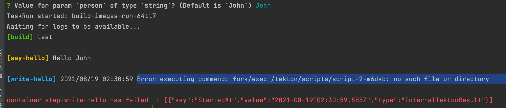 - name: write-hello #Tekton thsi step fails! Error executing command: fork/exec /tekton/scripts/script-2-m6dkb: no such file or directory