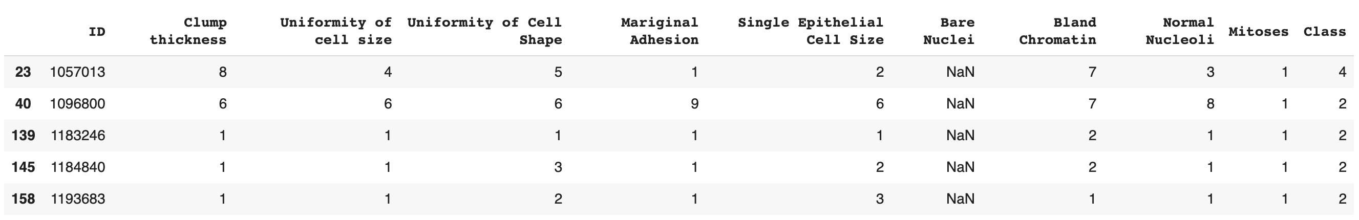 selection_condition = pd.isna(df["Bare Nuclei"]) & (df["Class"] == 2)