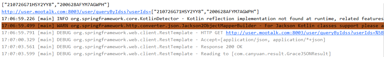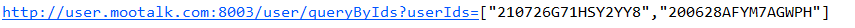如果您在Postman中构建了这样的请求:http://user.mootalk.com:8003/user/queryByIds?userIds=[\"210726G71HSY2YY8\",\"200628AFYM7AGWPH\"],那么它工作得很好。