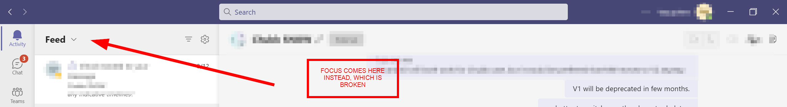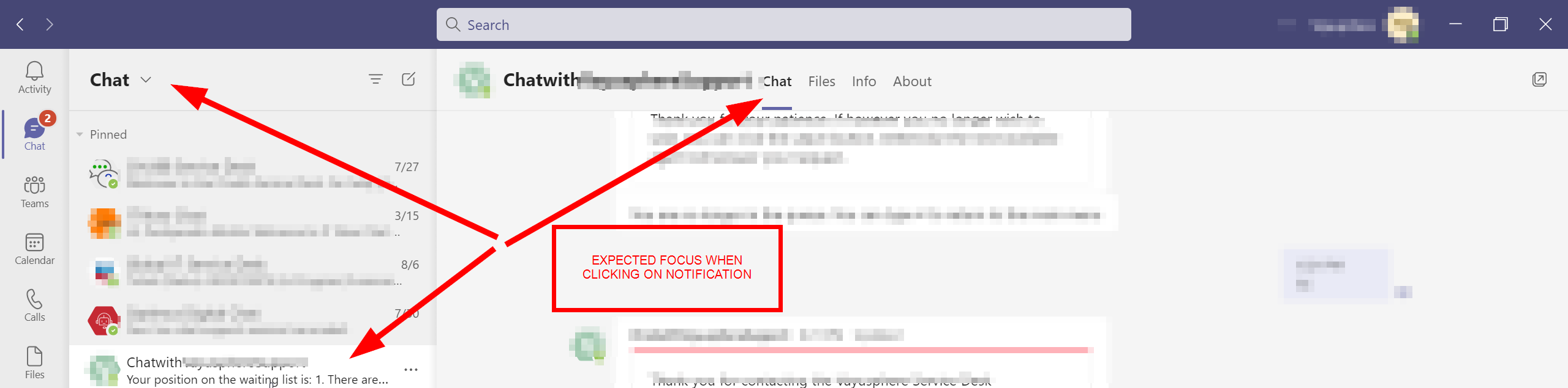 这种分散的焦点行为似乎只发生在从机器人接收到的聊天消息中。可在Windows和Mac客户端复制。用户对用户消息通知的团队客户端按预期工作,这是点击立即带您到相应的用户聊天窗格。