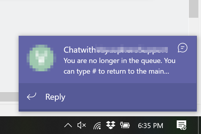 BotX发送或回复来自团队用户的1:1聊天消息。如果团队用户UI焦点不在团队客户端上,或者不在团队客户端上,而是不在该会话上,则团队客户端将显示一个敬酒通知(出现在系统托盘中的弹出窗口)。到目前一切尚好。